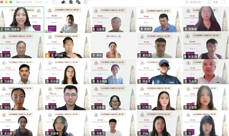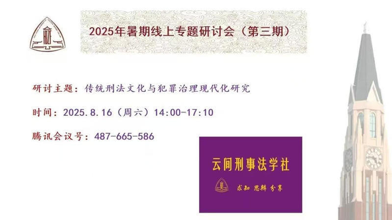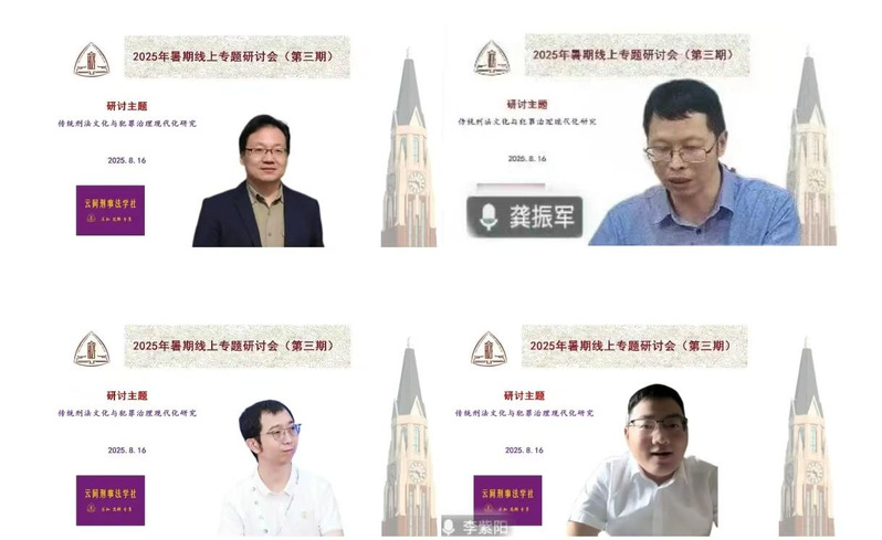 此前的8月16日,云间刑事法学社暑期第三期线上研讨会已率先预热,以传统刑法文化研究为切入点,为后续论坛的深度研讨奠定了坚实基础。暑期线上研讨会围绕“传统刑法文化与犯罪治理现代化研究”展开学习交流。华东政法大学张勇教授、9428cn太阳集团古天乐龚振军副教授、上海师范大学刘振宇副教授、东北财经大学李紫阳副教授及华东政法大学、同济大学、北京师范大学、9428cn太阳集团古天乐、湘潭大学、南京师范大学、上海政9428cn太阳集团古天乐等多所院校硕、博研究生40余人共同参加。